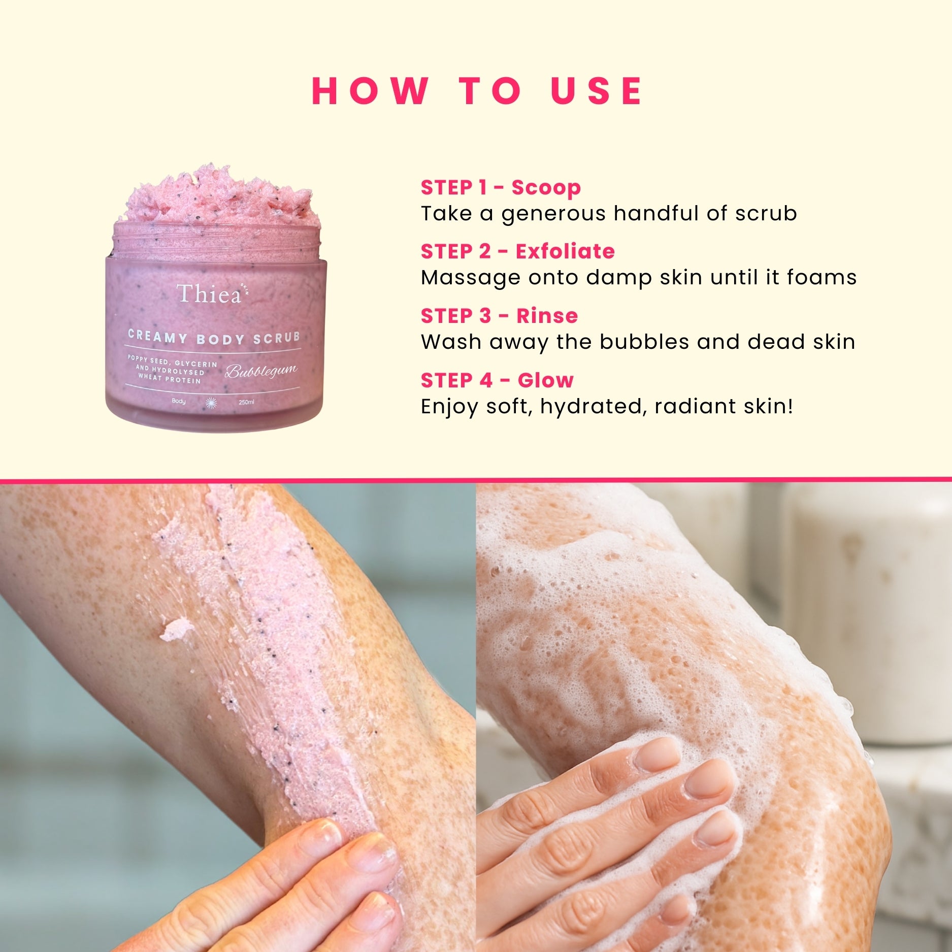 We recommend using our body scrubs 2–3 times a week to exfoliate and refresh your skin. Follow up with our body cream daily (especially after showering) to lock in moisture and keep your skin hydrated and radiant.