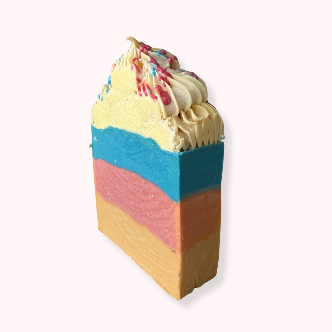 Take a stroll through a fruit-filled marketplace with our luscious Rhubarb & Strawberry Soap. This one has blue, pink and golden layers with three different colours of soap drizzle!